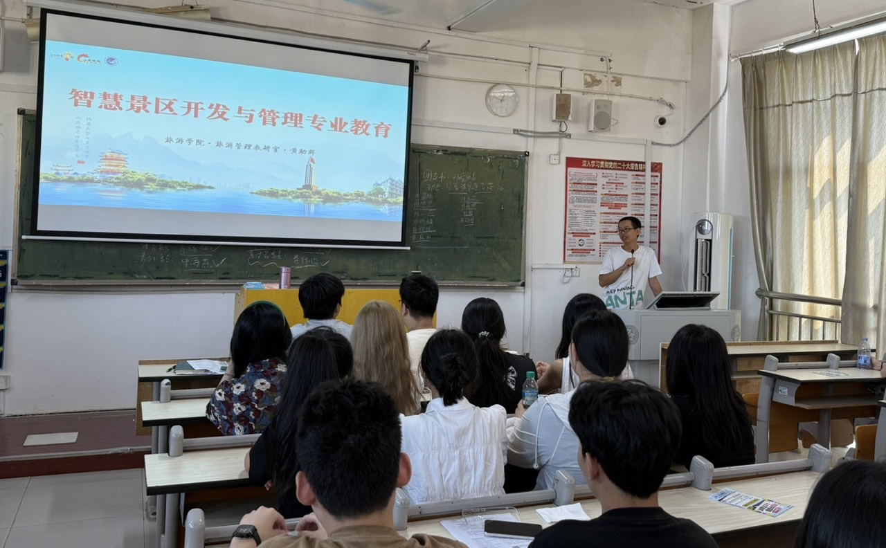 黄助群老师率先打开话匣,以自身六年旅游规划一线从业经历为切入点,结合参与的智慧景区项目案例,向同学们生动分享了从事智慧景区规划与开发工作的实践心得与行业感悟。随后,他围绕专业设立的核心定位、课程体系中的学习重点、行业发展的潜力趋势以及未来多元的就业方向四大维度,系统且细致地展开讲解,让同学们对专业有了更全面的认知。