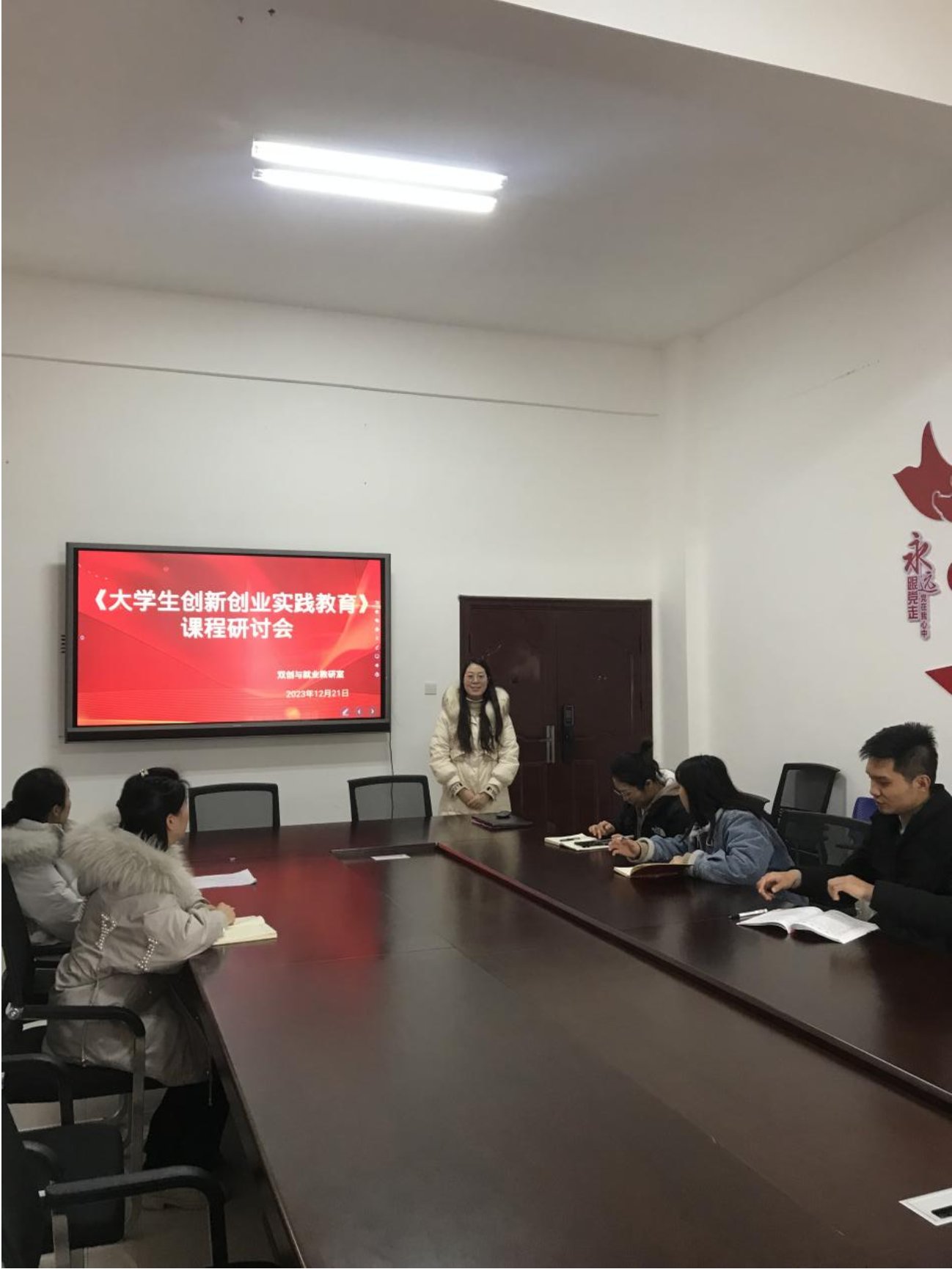 2023年12月21日下午,双创与就业教研室在产教融合大楼113会议室,开展了《大学生创新创业实践教育》课程研讨会,会议由教研室主任孟雅雯老师主持,双创与就业教研室专兼职教师参加了此次会议。