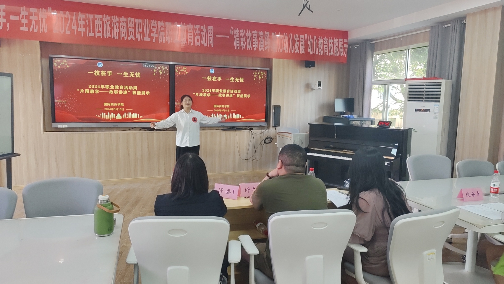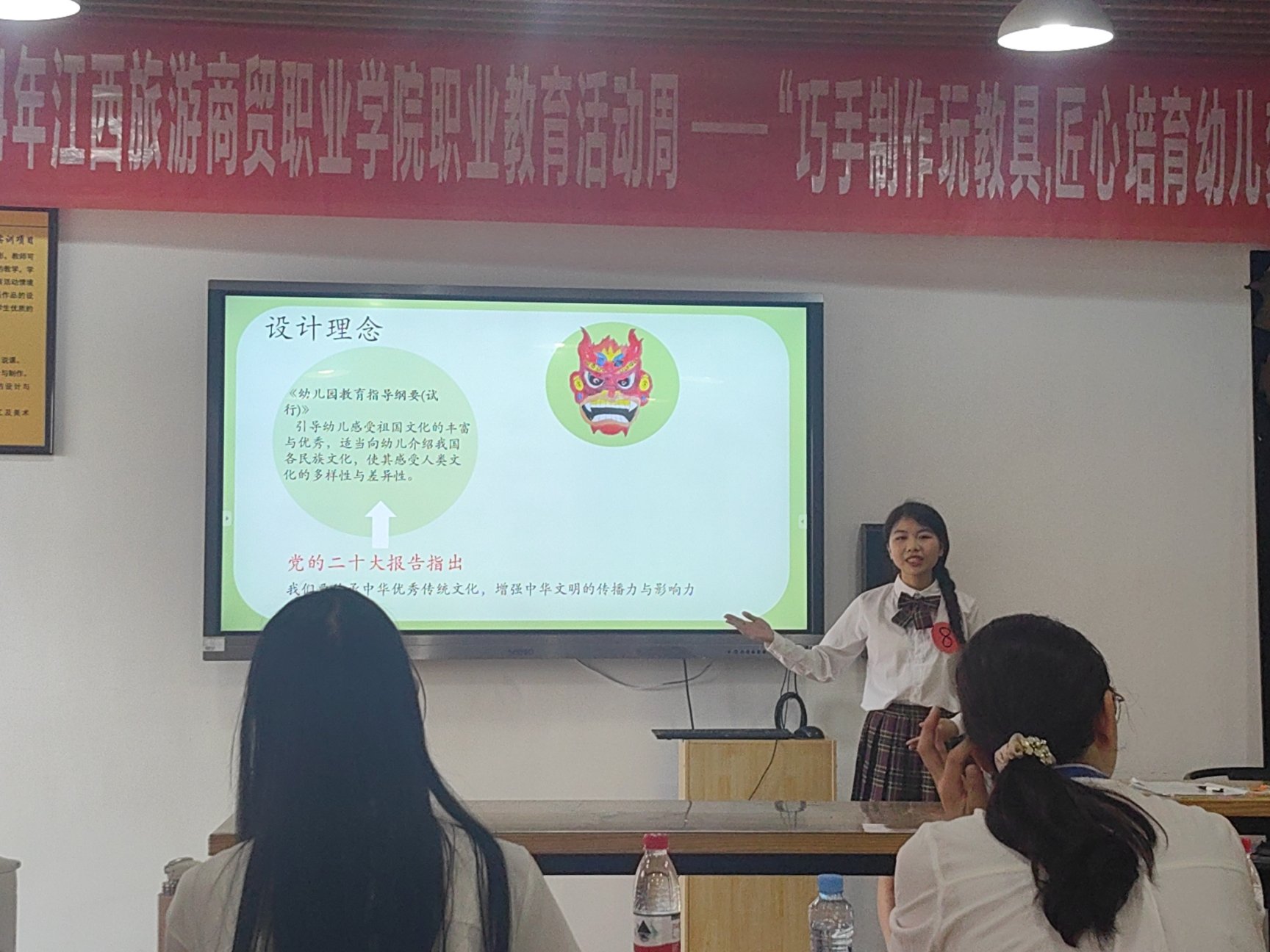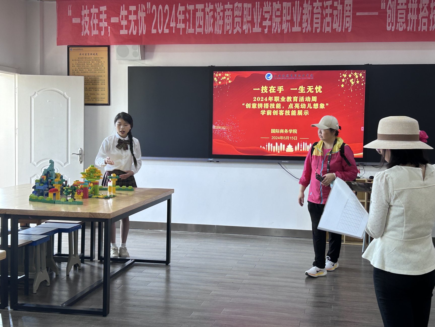 为做好 2024 年职业教育活动周相关工作,充分展示我院职业育改革成果、典型经验和积极贡献,大力宣传劳模精神、劳动精神、工匠精神,弘扬劳动光荣、技能宝贵、创造伟大的时代风尚,进一步在全社会营造关心支持职业教育改革发展的良好氛围,结合学前教育专业学生专业水平,学前教育教研室认真制定了技能展示的方案。玩教具设计制作与展示、幼儿创意拼搭和儿童故事讲述三大赛项是学前教育专业学生必须掌握的重要技能,为了提高学前教育专业学生的专业素养和教学能力,于5月15日下午举行“职业教育技能活动周”学前教育技能竞赛。本次大赛严格按照方案和流程,以实践操作方式进行。通过预赛、决赛方式,确保了大赛活动公开、公平、公正开展。