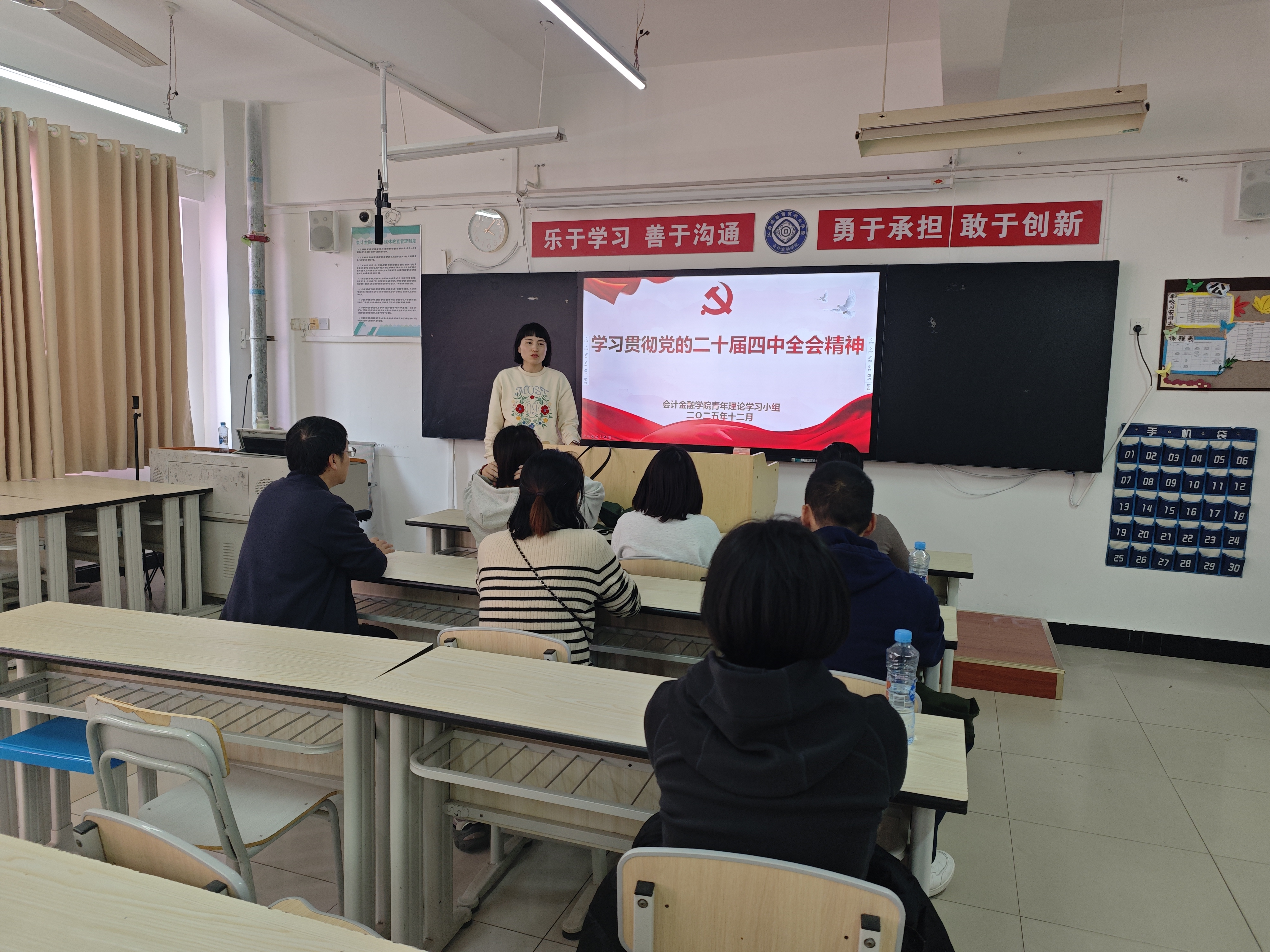 活动中,教研室主任率先领学党的二十届四中全会公报核心内容,结合金融行业发展趋势与职业教育育人目标,系统解读了全会提出的“深化金融体制改革”“服务实体经济高质量发展”“防范化解金融风险”等重要部署。通过政策原文研读、行业案例分析、育人方向对标等环节,引导教师们深刻认识到,将全会精神融入专业教学是落实“为党育人、为国育才”初心的关键举措,也是提升金融人才培养针对性与实效性的必然要求。
