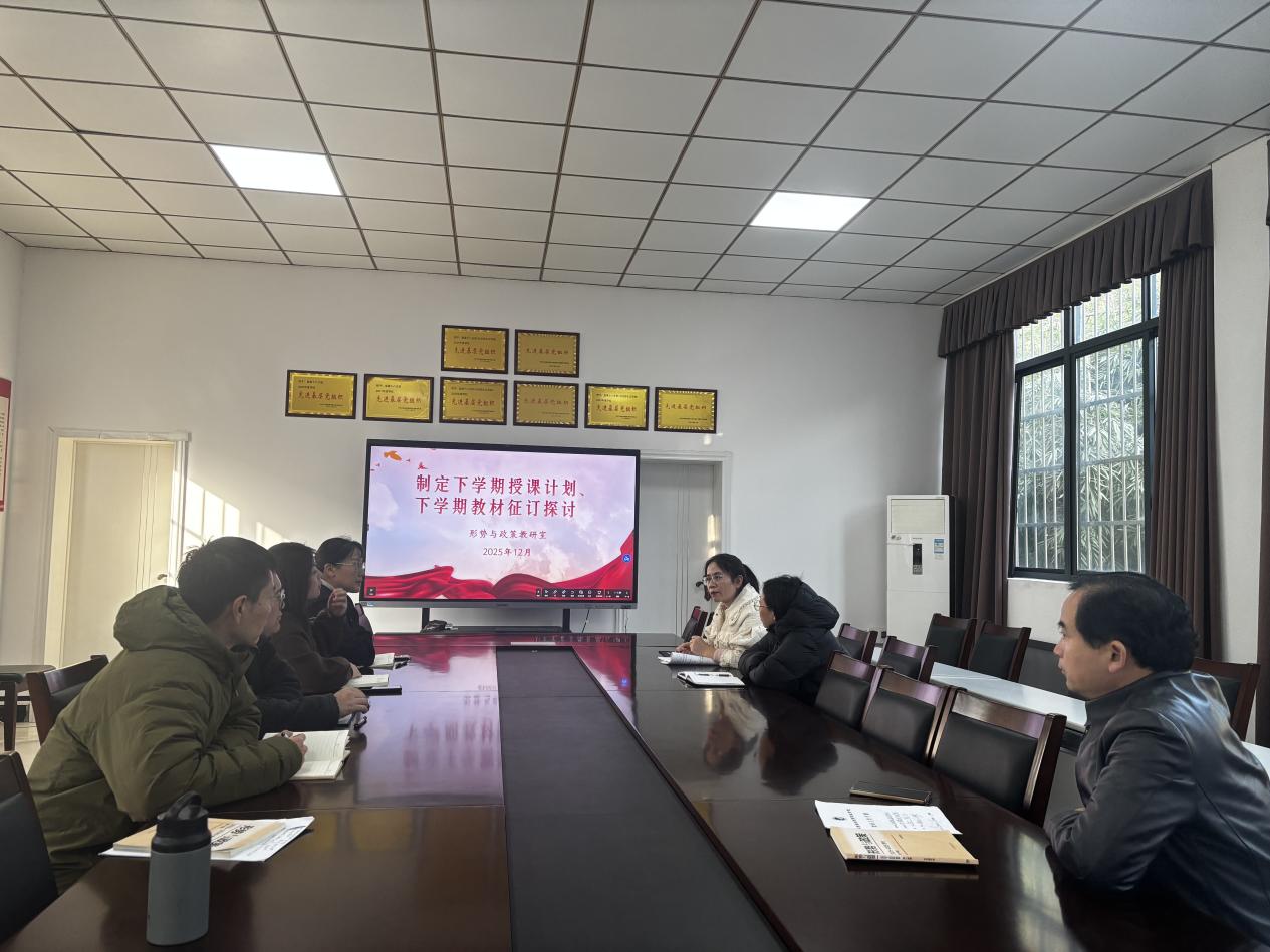 为系统梳理学期教学工作成效,科学谋划下学期教学安排,持续深化理论学习与教学实践融合,2025年12月30日,形势与政策(德育)教研室组织全体教师开展主题教研活动,围绕学期总结、教学规划、文件学习三大核心内容有序推进,取得扎实成效。
