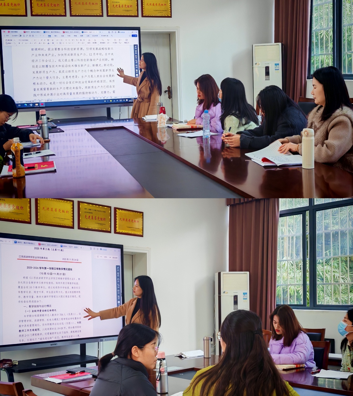 在期末工作部署阶段,会议结合教研室工作实际,对期末重点工作进行了全面细化安排。常规工作方面,明确要求完成下学期授课计划、教师选派及教材征订计划制定,全面开展期末教学检查,扎实做好期末考试命题等工作;政策理论学习方面,部署了《江西省高等职业学校办学能力评价评估工作方案》《高水平师资队伍建设:教师教学档案袋应是满足组织发展需要与教师个人成就需要的双向支点》等文件的学习任务;课程教学与质量建设方面,强调要推进AI教学平台试用研讨,确定适配本课程的创新平台,加快智能体、知识图谱和能力图谱建设,并按要求完成全校说课活动;师资队伍建设方面,明确积极准备思政类教学比赛,组织教师做好近五年短期企业实践申报;党建与教师思政工作方面,安排了《习近平:因地制宜发展新质生产力(<求是>2025年第22期)》的专题学习,强化教师思想政治建设。