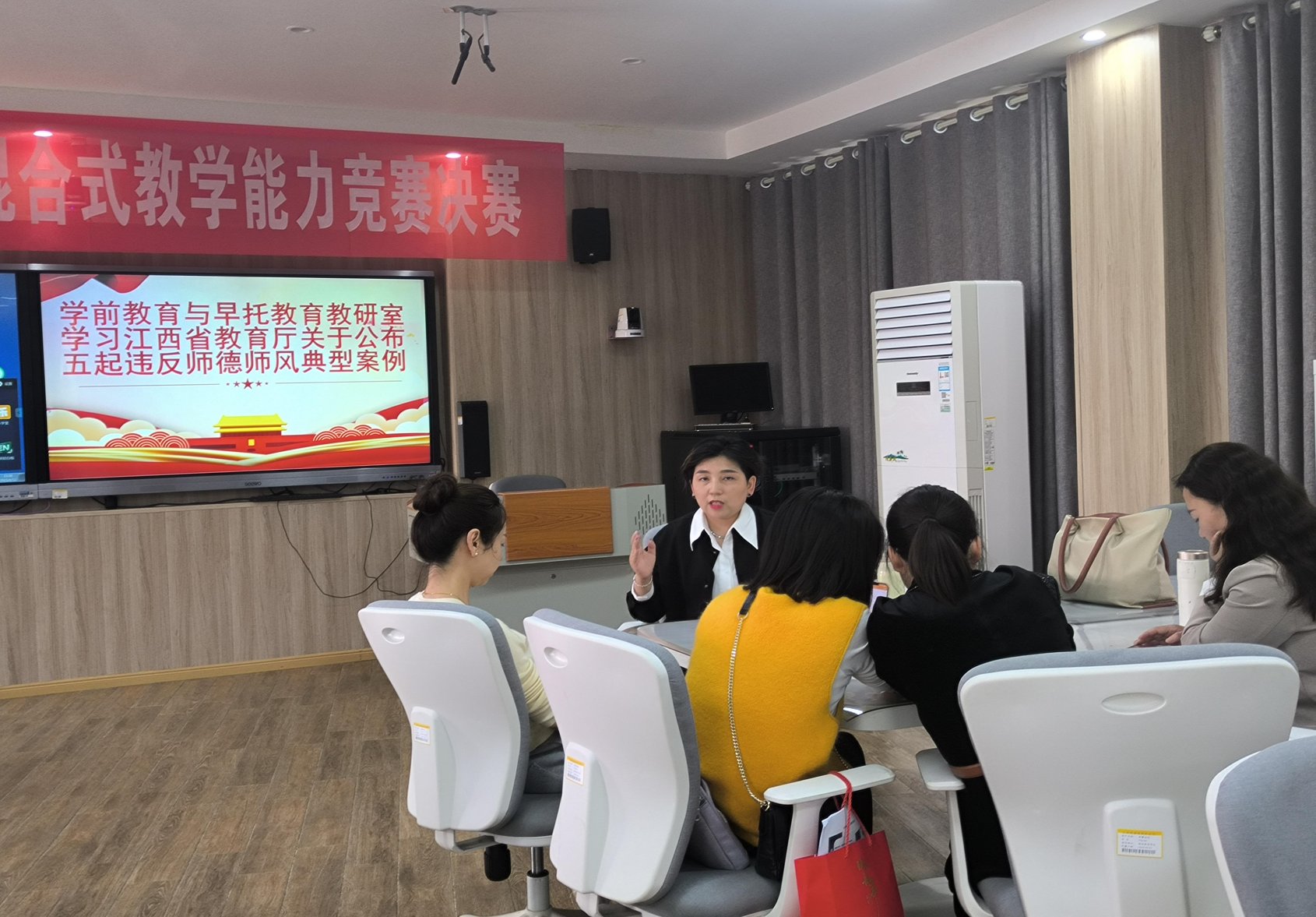 2023年4月12日,国际商务学院学前教育、早托教研室在智慧教室开展集体学习《江西省教育厅关于公布五起违反师德师风典型案例》,刘思老师主持学习并作总结讲话。
