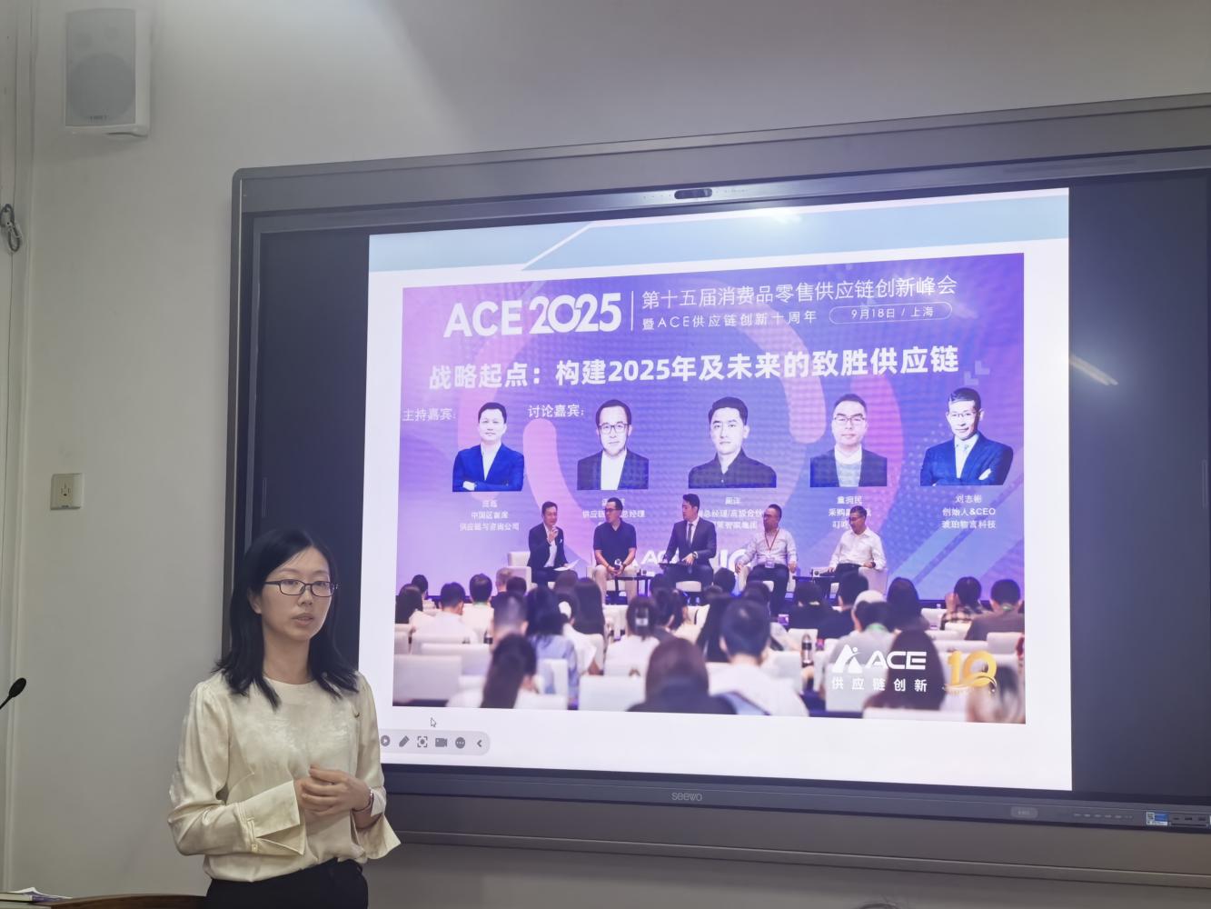 会上,刘琼老师率先分享ACE2025第15届消费品供应链创新峰会经验。峰会以"链动十年:数启新章·智链全球"为主题,汇聚千余名行业专家与企业高管,围绕一体化供应链计划、智能算法应用、动态库存优化等关键议题研讨。她重点介绍"智能供应链控制塔"概念,解读其在端到端协同与全链路优化中的核心作用,并结合教学实际,建议在《供应链管理》等课程融入弹性网络设计、AI库存管理等前沿内容,助力学生把握行业技术方向。