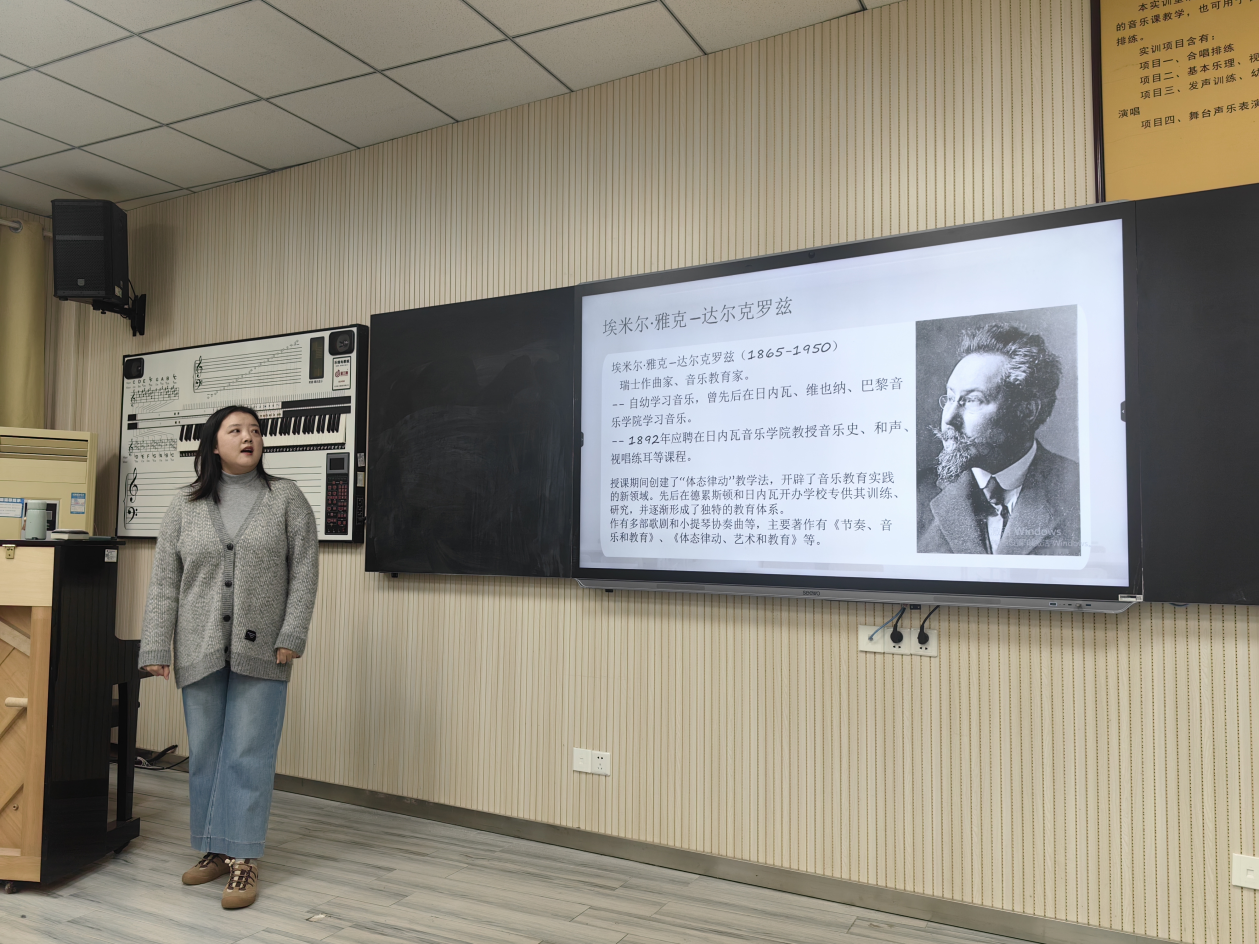 活动中,刘腾、肖晴山两位老师依次围绕各自公开课内容进行了精彩分享。刘腾老师聚焦“1~1.5岁婴幼儿语言发展特点”教学实践展开分享,深入剖析了该年龄段婴幼儿语言发展的核心规律,并结合公开课中的实操案例,讲解了如何将抽象的发展理论转化为具象的教学活动。例如,针对婴幼儿单音节和叠词表达特征,设计了“亲子叠词互动游戏”,通过引导幼儿模仿“爸爸”“妈妈”“宝宝”等叠词,深化学生对知识点的理解,最后还作业布置上设置了小巧思,让学生自行在网络找对应年龄幼儿,分析其语言特点。肖晴山老师将达尔克罗兹音乐教学法运用于幼儿音乐教育活动中,引导学生运用身体配合节奏特点进行律动。