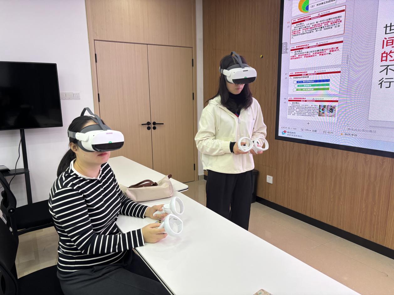 作为本次公开课的核心亮点,VR沉浸式教学的魅力在专业实训室内展现得淋漓尽致。这间智慧景区专业VR实训室搭载了8K高清虚拟渲染系统,彻底打破了传统课堂“挂图讲景、照本宣科”的局限。当听课教师们戴上轻量化VR眼镜,瞬间完成了从“教室”到“景区”的空间跨越。在李卓琪老师的引导下,大家跟随虚拟导览路线行走,指尖轻触设备手柄,实现“游览+学习”的同步推进。“以往讲景区导览,只能靠图片和视频让学生想象空间布局,现在有了VR技术,学生能直观感知游览动线、景点位置关系等真实场景。”刚体验完的胡朝霞老师深有感触地说。