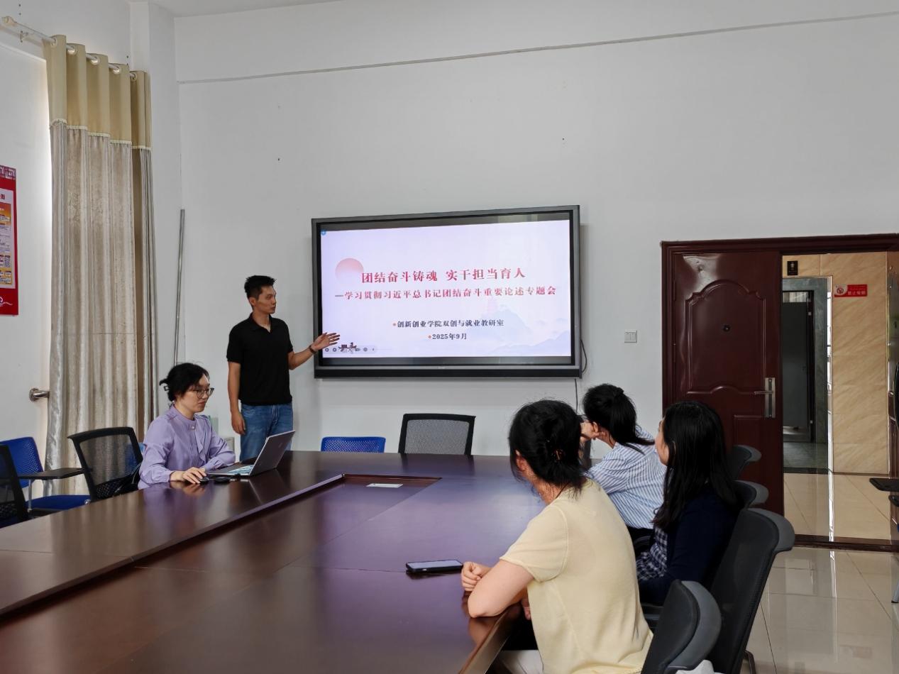 9月24日,双创与就业教研室组织全体专职教师召开专题会议,学习“团结奋斗铸魂 实干担当育人—学习贯彻习近平总书记团结奋斗重要论述”。