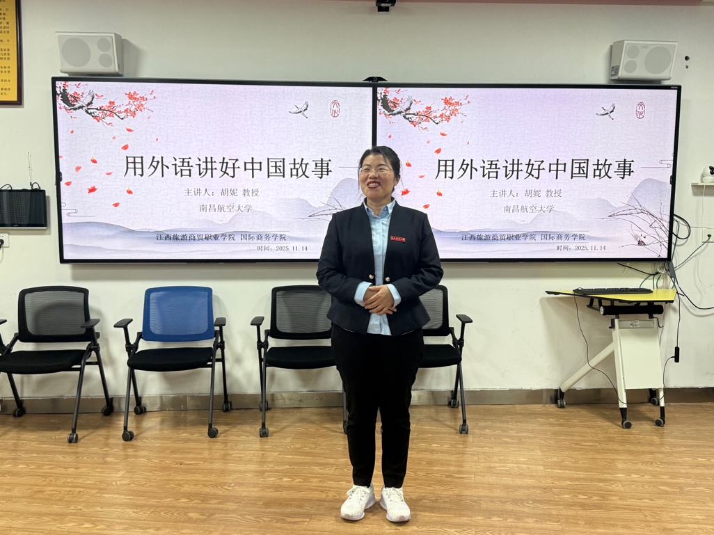 2025年11月13日,南昌航空大学胡妮教授受邀莅临我院,开展以“用外语讲好中国故事”为主题的交流讲座。校党委委员龙婷教授、国际商务学院院长周淑华、副院长王明生及学院骨干教师齐聚一堂,共同参与交流学习。