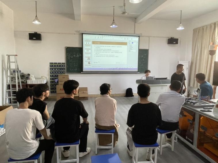 在培训过程中,围绕工业机器人、数控加工、PLC编程三门核心课程的相关知识,华航工程师详细解析了设备的工作原理,通过模块化教学和实操演示,具体展示了设备的流水线生产模式,使师生们对设备有了更加直观和深入的理解。
