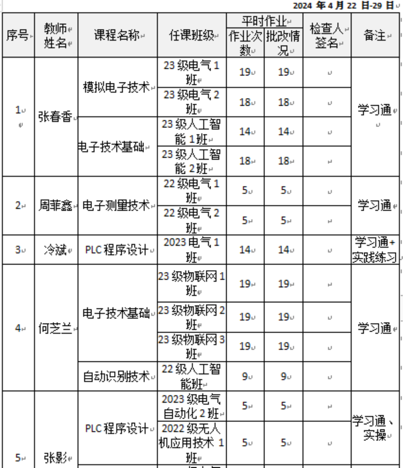附部分教师作业自查表和教学进度自查表: