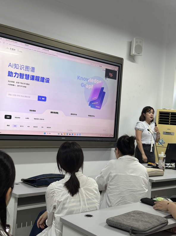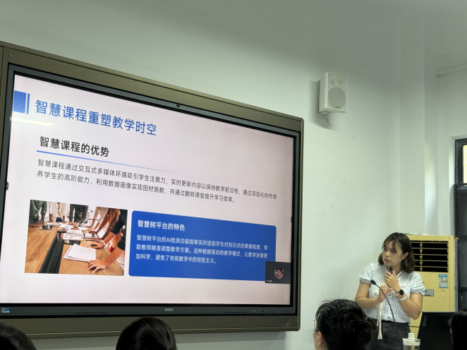 吴琼老师担任本次讲座的主讲。她从平台核心功能入手,结合操作演示,详细讲解了 “智慧树” 在课程资源搭建、互动教学开展、学情数据追踪等方面的应用方法。为让讲解更具针对性,吴琼老师以民航乘务英语课程为例,展开智慧课程设计思路的分享。她提出 “场景化 + 分层化” 的设计框架:在课程资源层面,通过上传机场值机、机舱服务、应急处置等一系列教学视频,让学生沉浸式体验乘务英语应用场景;在教学活动设计上,通过在线收集学生的学习数据和掌握情况,给学生画像,因人而异推送学习任务。在考核评价环节,利用平台的过程性评价功能,将课堂互动、作业完成度、模拟任务表现纳入考核体系,打破 一考定成绩的传统模式。这样的设计既贴合民航乘务专业的岗位需求,又能通过智慧工具提升教学效率,解决传统课堂中实践机会少、学情难掌握的问题。吴琼老师的分享引发在场教师共鸣,不少教师拿出手机拍摄屏幕重点或在笔记本上记录要点。