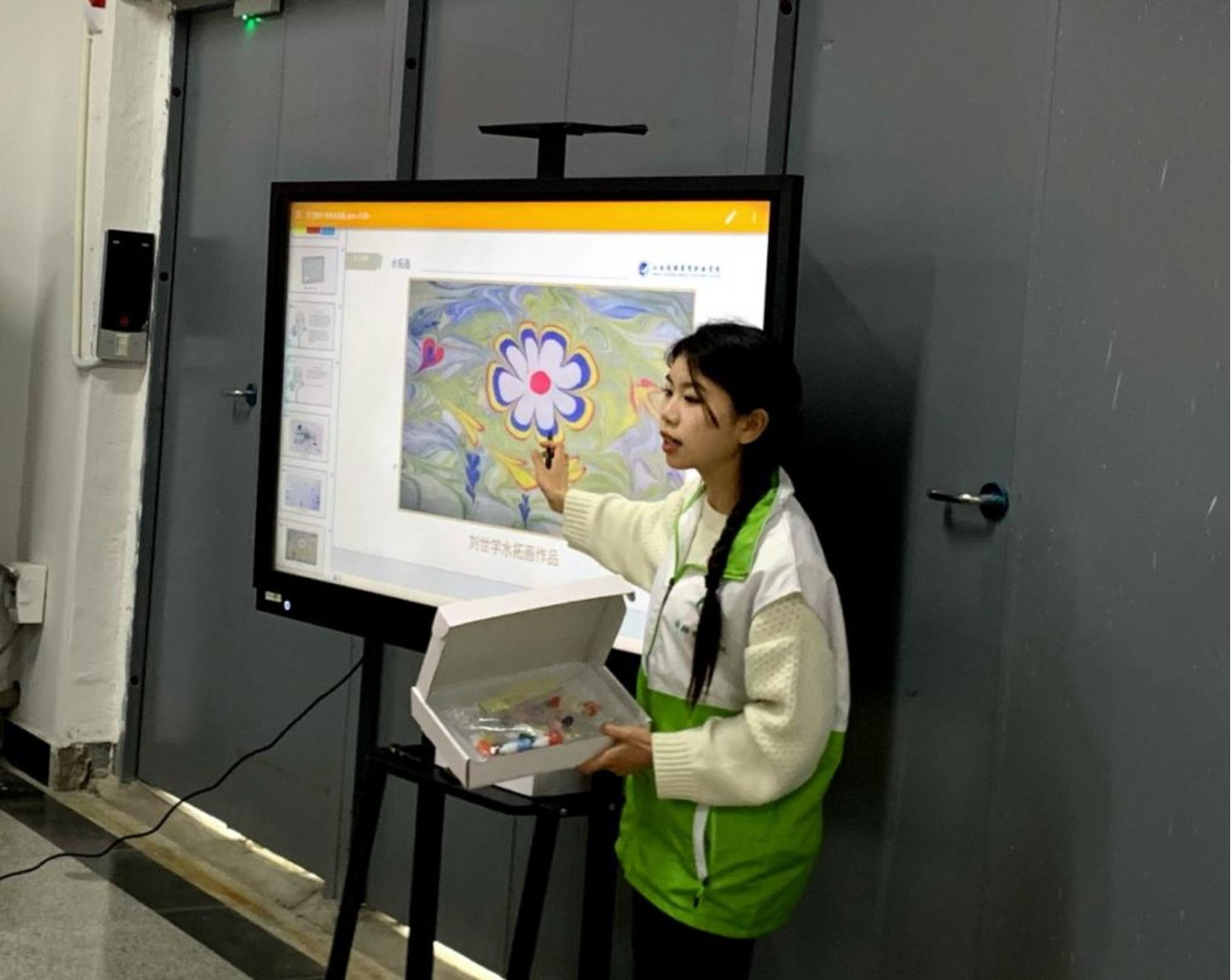 在正式进行水拓画活动之前,首先由学生志愿者吴权凤化身小老师与孩子们亲切交流日常使用的绘画方式,进而提出问题“你们相不相信在水面上也可以画画呀”,以此引起孩子们的好奇心,从而引出绘画主题——传统水拓画。
