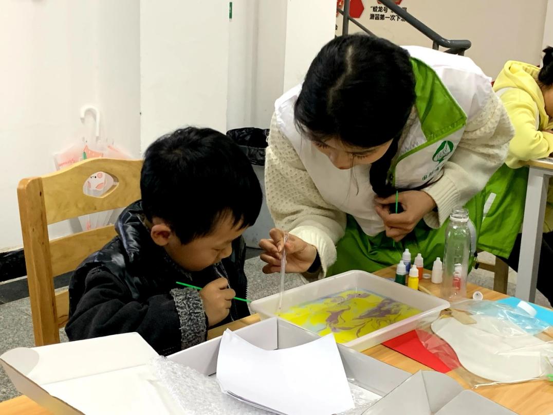 在正式作画过程中,孩子们迫不及待地尝试自己动手操作,在老师与志愿者的引导下,大胆发挥想象力,创作了极富个性的水拓画作品。活动的最后,小老师引导孩子们热情自信地向老师介绍自己的作品,并将其晾挂在晾晒绳上,色彩纷呈的水拓画形成了一道道亮丽的风景线。在整个活动中,孩子们的认知、想象力、动手操作能力等都得到了充分地锻炼。