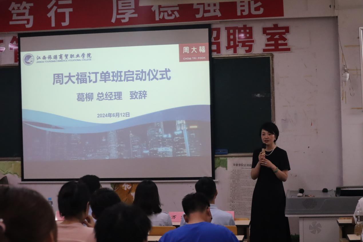 在启动仪式上,经济管理学院副院长傅俊对周大福订单班的启动工作给予了充分肯定,他强调了校企合作的深入性,产教融合的重要性,对订单班的成立充满信心。他相信,学生们通过订单班的定向培养,将来可以直接走上工作岗位,满足用人市场的实际需求。周大福江西运营老总葛柳发表了讲话,她表示我校是周大福在江西合作的第一所高校,很重视此次订单班的合作模式,将全力支持订单班的各项工作。周大福南昌高级营销经理胡琰超也进行了宣讲,介绍了周大福的企业历程,讲述了他自己如何从一个大学毕业生成长为南昌地区负责人的经历,鼓励同学们制定自己的职业规划。